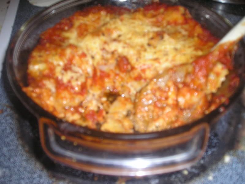 Once ravioli are finished boiling, layer them in a baking dish with marina sauce, sprinkle with parmesan and bake until cheese is bubbly!